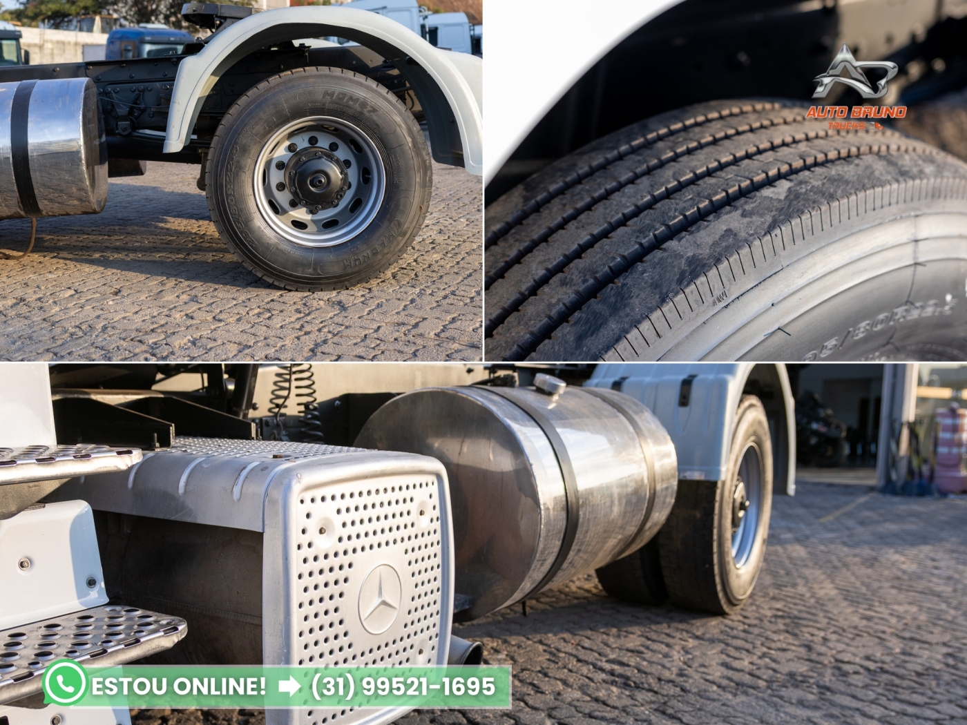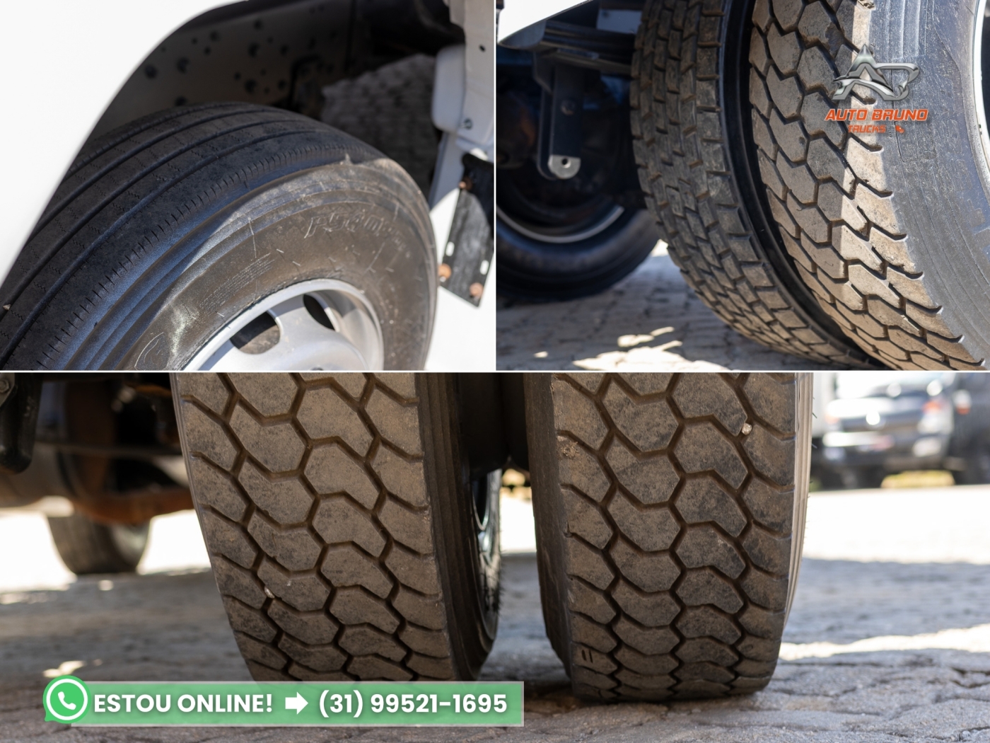 Pneus: Medida 295/80. Pneus dianteiros com 90% de borracha e pneus de tração borrachudos com 60%, conforme as fotos.