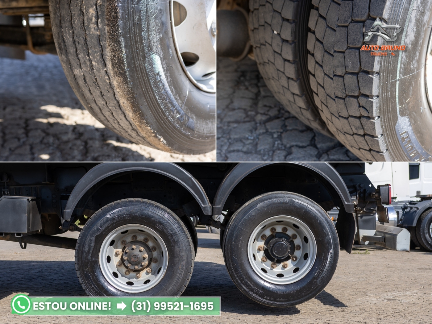 Pneus: Medida 275/80 e conforme as fotos os pneus da tração são borrachudos com cerca de 90% de borracha, truck liso com mais de meia vida e dianteiros novos com aproximadamente 90%, Bitruck com 60%.