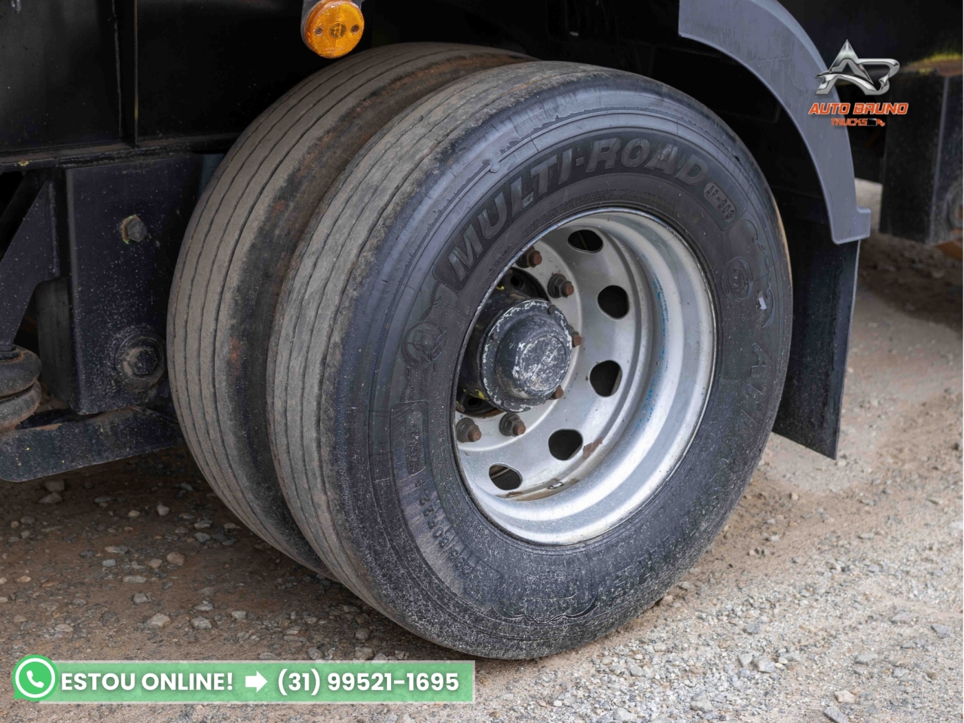 Medida 295/80 R22.5, com os 12 pneus em meia vida (aproximadamente 50% de borracha).