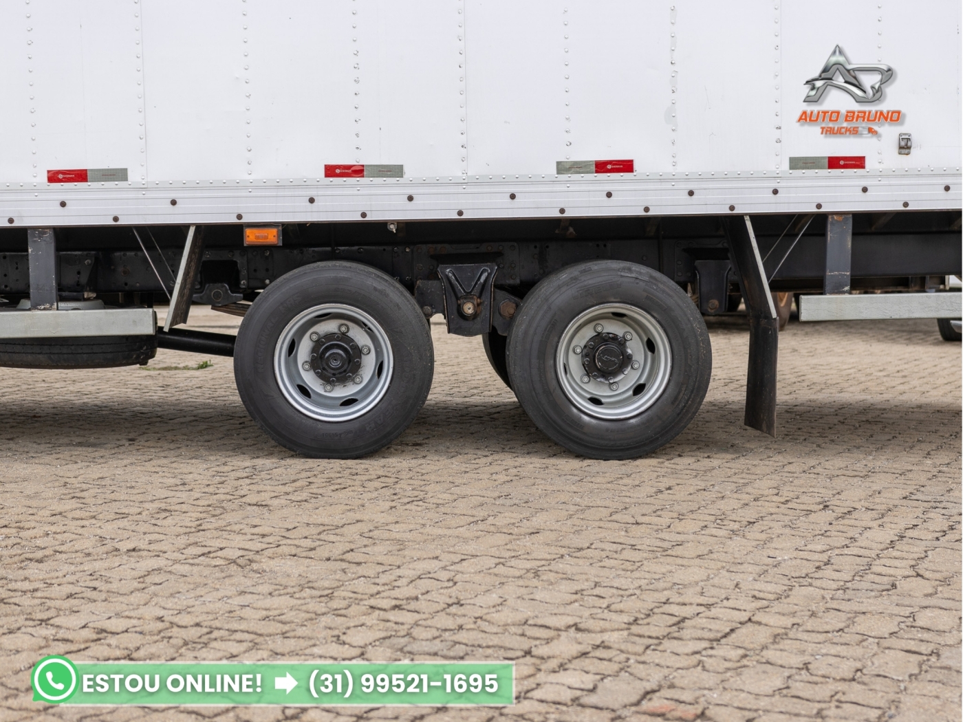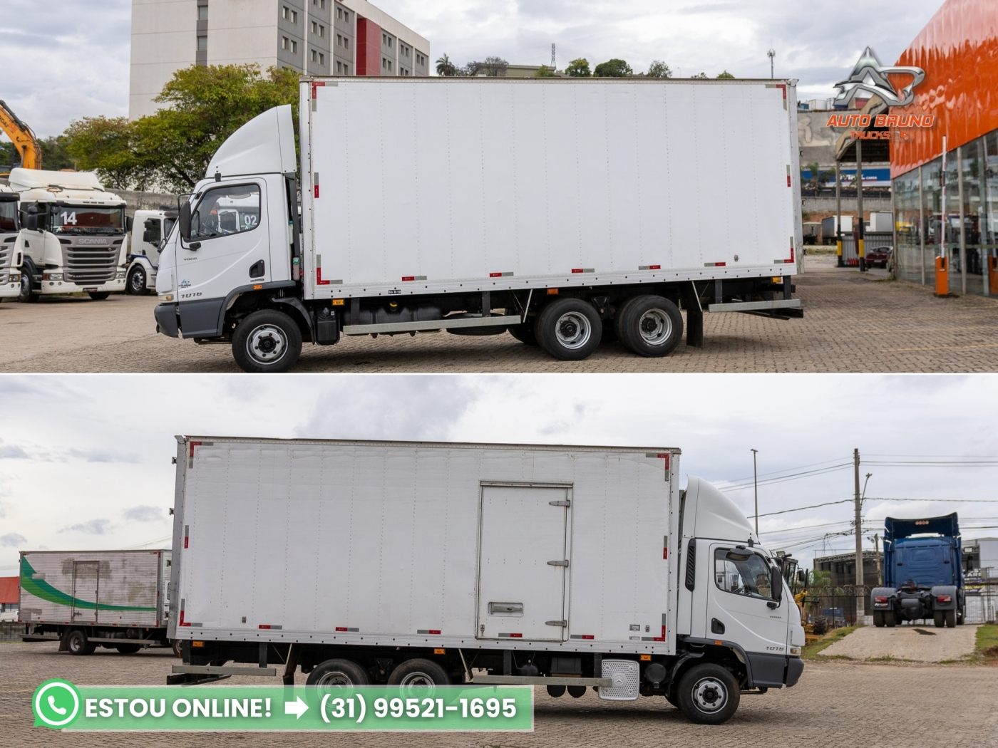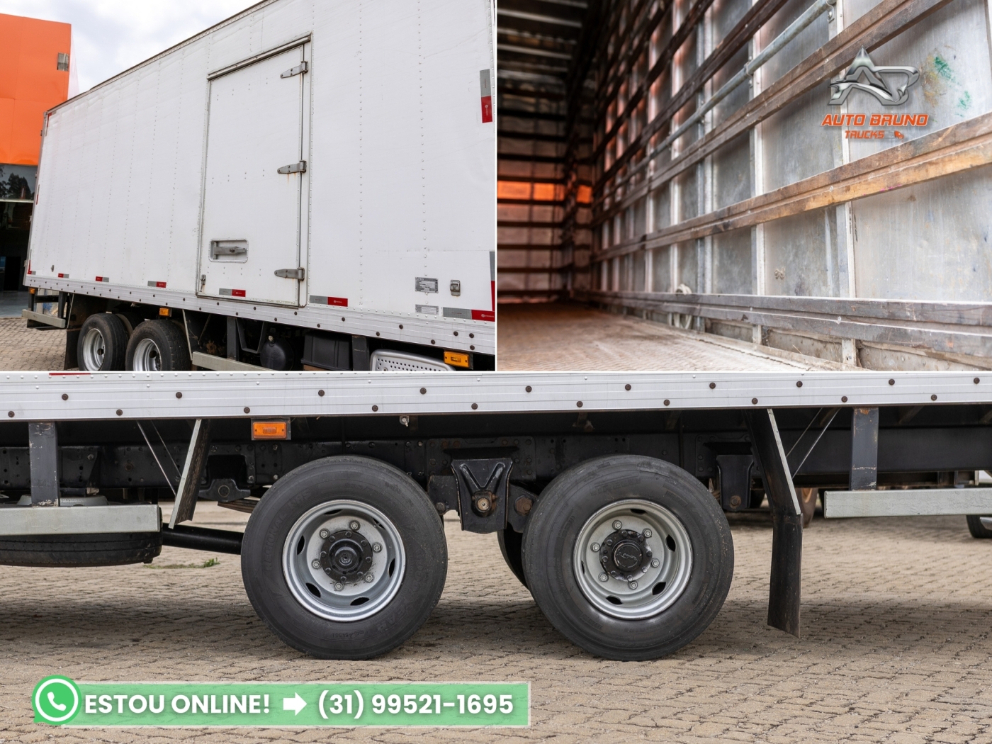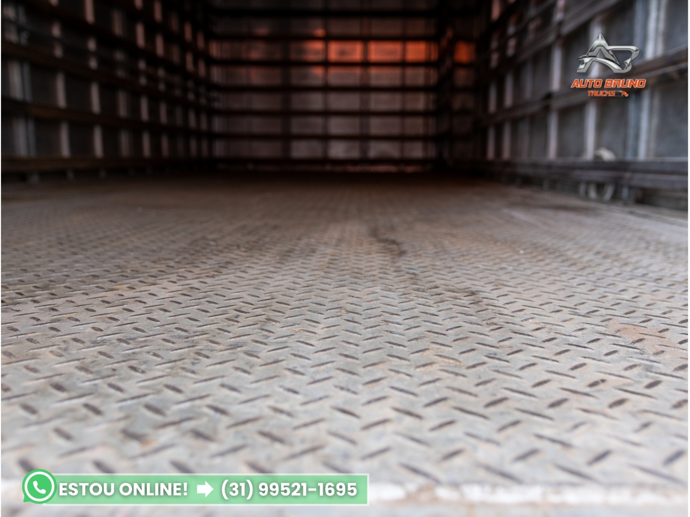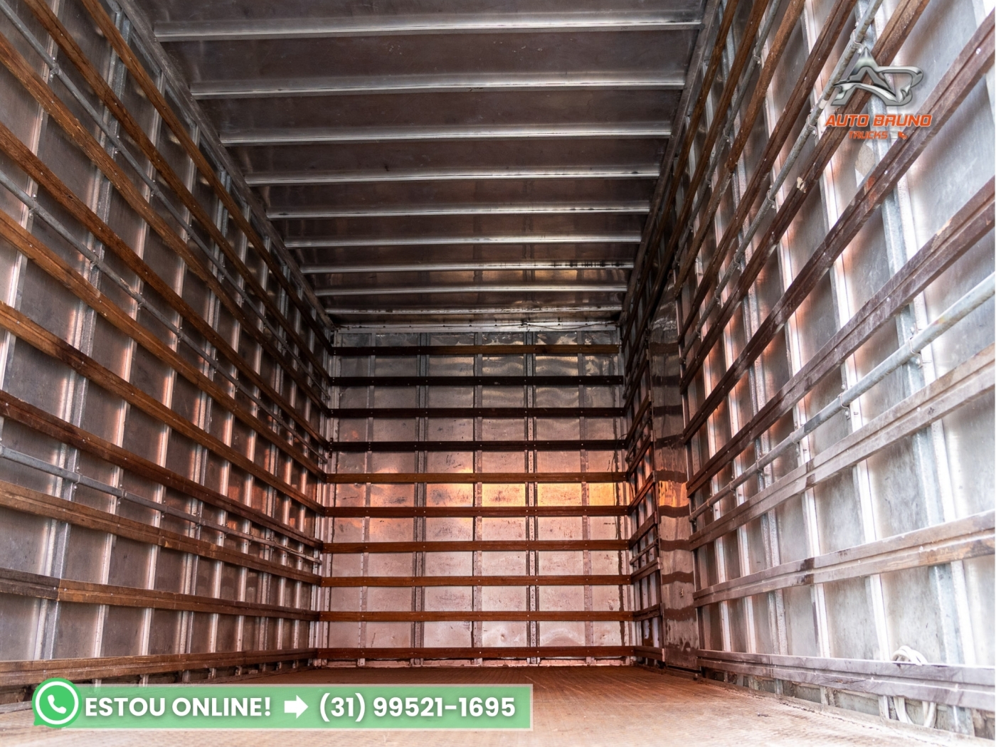 Baú de fibra chapeado, com 6,50m de comprimento, 2,60m de altura e 2,20m de largura. Equipado com portas traseiras e laterais, estrutura em ótimo estado, ideal para logística de carga seca, hortifrúti ou eletrodomésticos.