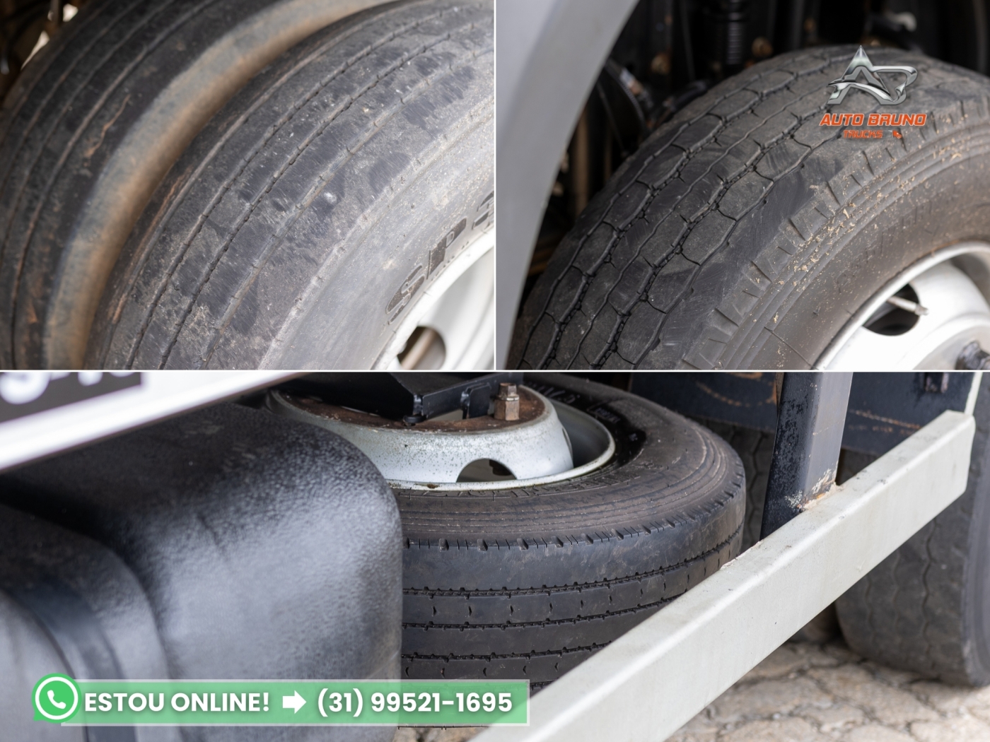 Medida 235/75 R17.5. Pneus dianteiros com aproximadamente 80% de borracha. Conjunto de tração e truco com cerca de 70%, todos em ótimo estado conforme fotos.