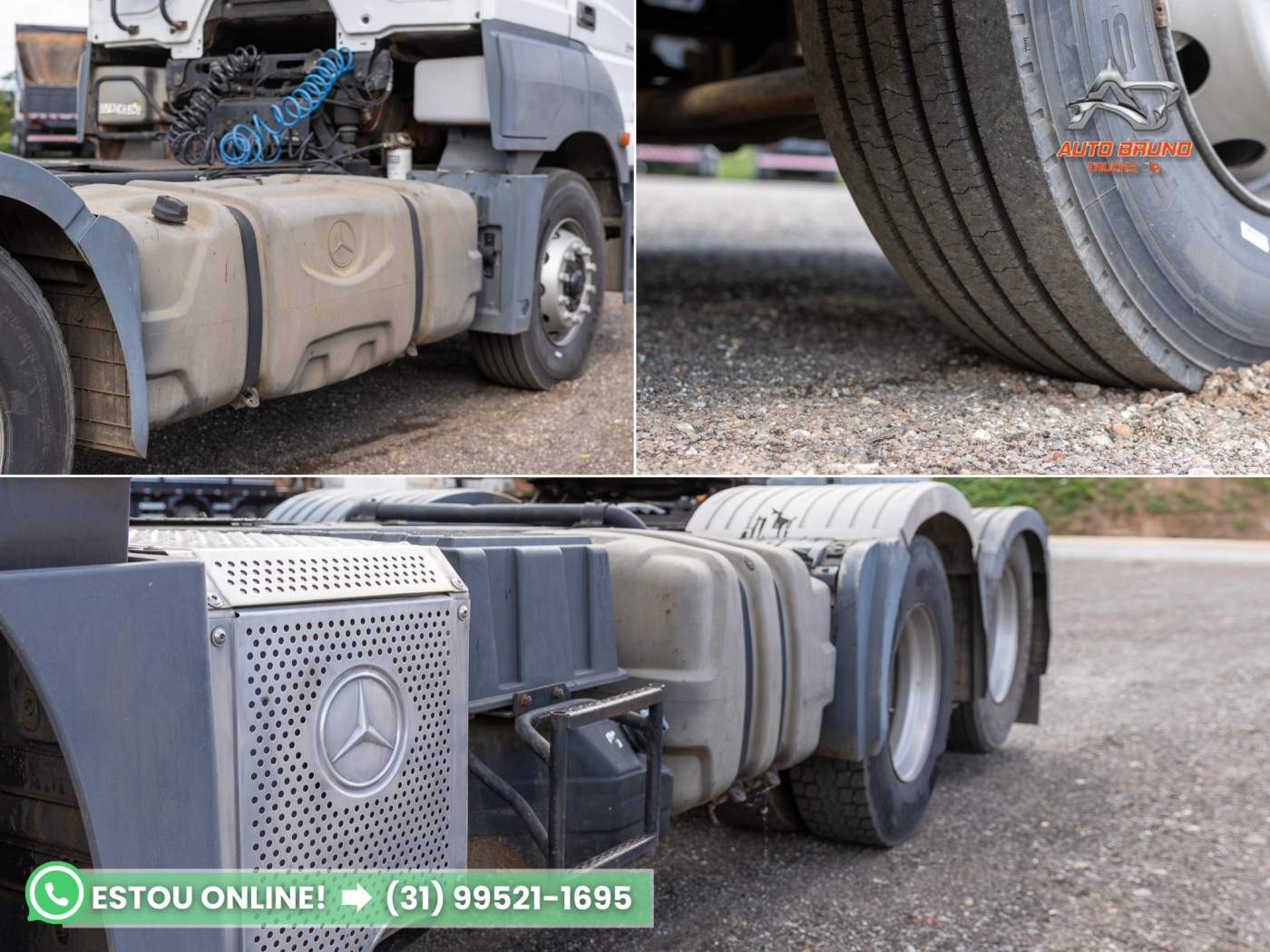 Com medidas 295/80 dianteiros com 80% de borracha, tração com pneus borrachudos em 60% e truck lisos com 60% de borracha aproximadamente.