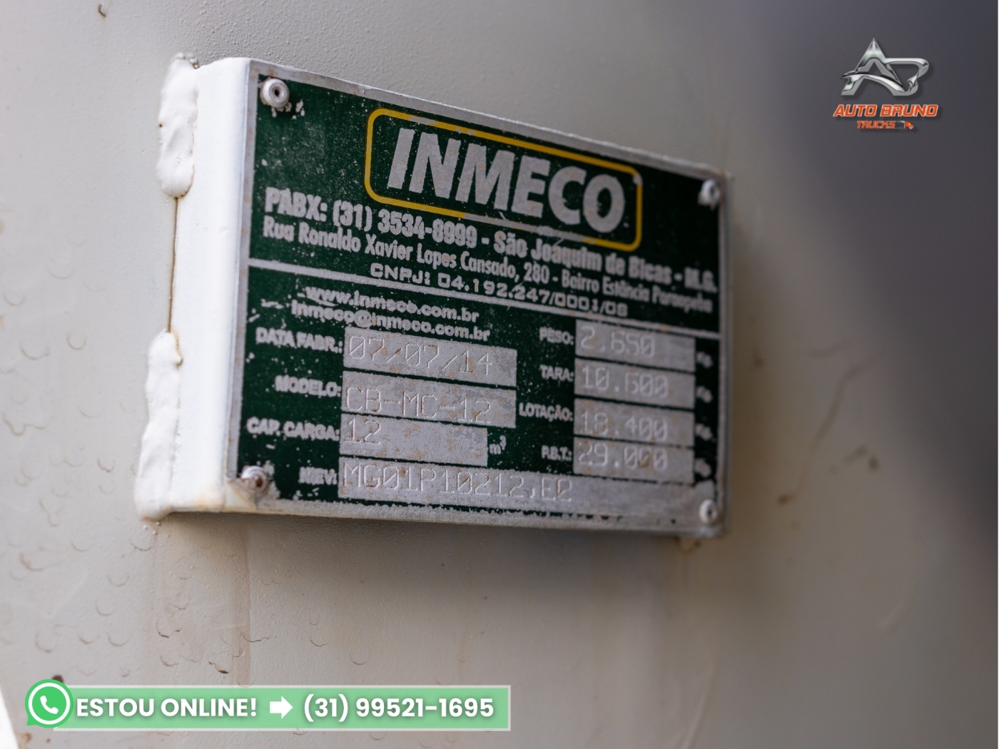Caçamba da marca Inmeco, ano 2014, com capacidade geométrica de 12m³. Peso da caçamba de 2.650 kg. Possui forminha, tampa traseira funcional e sistema hidráulico HYVA em perfeito funcionamento. Estado geral de uso, com algumas marcas, mas estrutura firme. Tara 10.600 kg / Lotação 18.400 kg / PBT 29.000 kg.