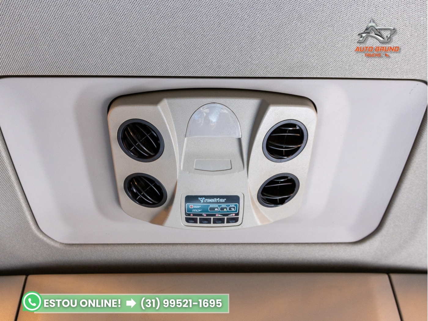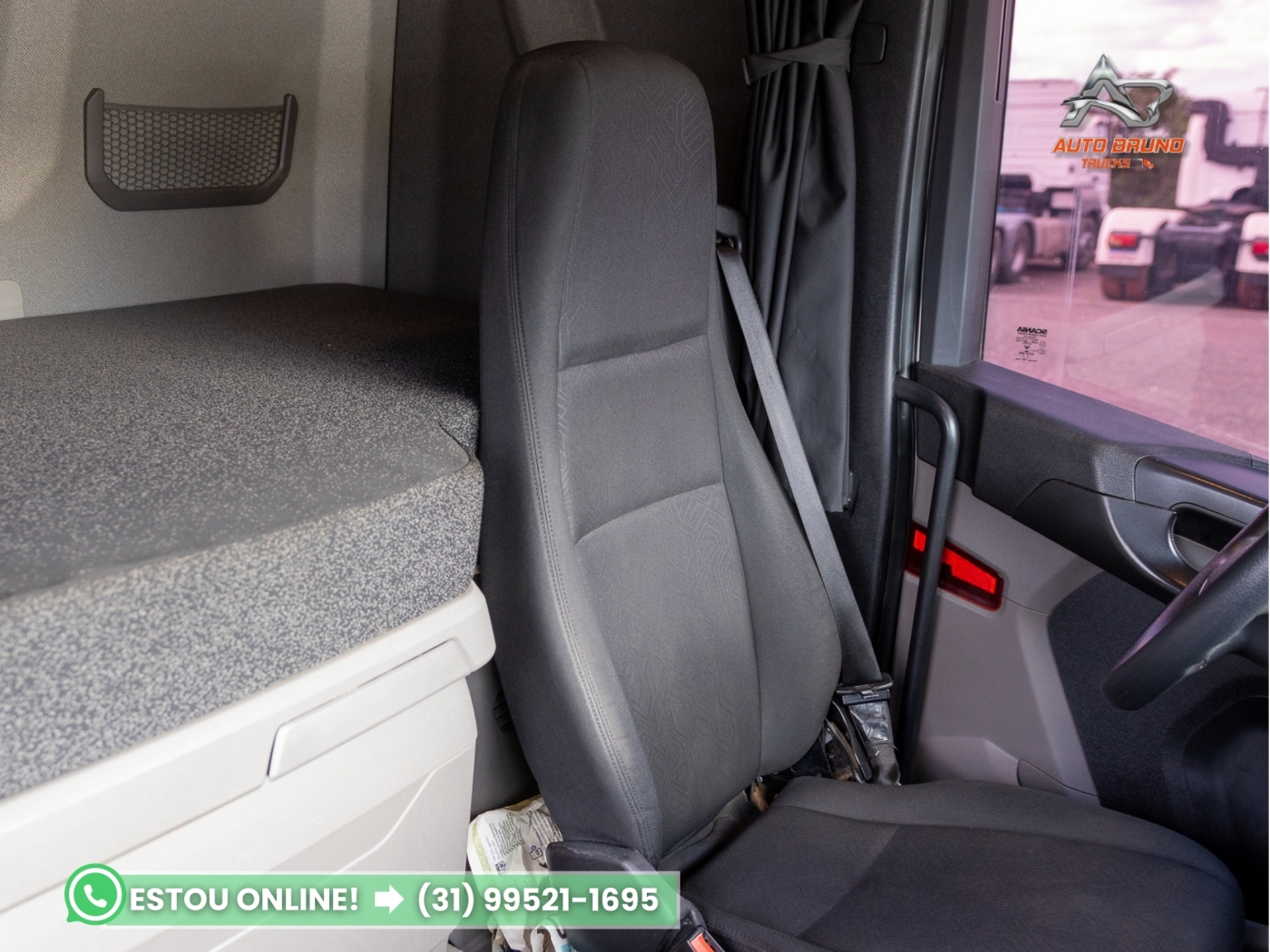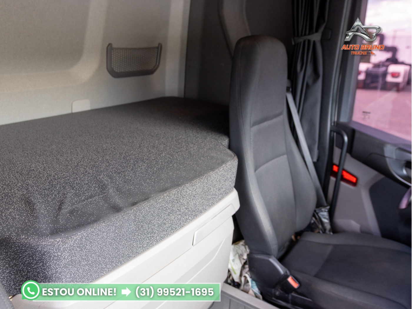 Cabine: Cabine extremamente conservada, com pintura em cor muito chamativa e presença de defletor de teto e defletores laterais. Interior em estado de zero, com excelente espaço interno e acabamento muito bem preservado. Possui interclima de teto, piloto automático, controle de bordo no volante, rádio original, vidros elétricos, retrovisores elétricos, bancos com regulagem de altura, gaveteiros originais e iluminação de teto na cabine.