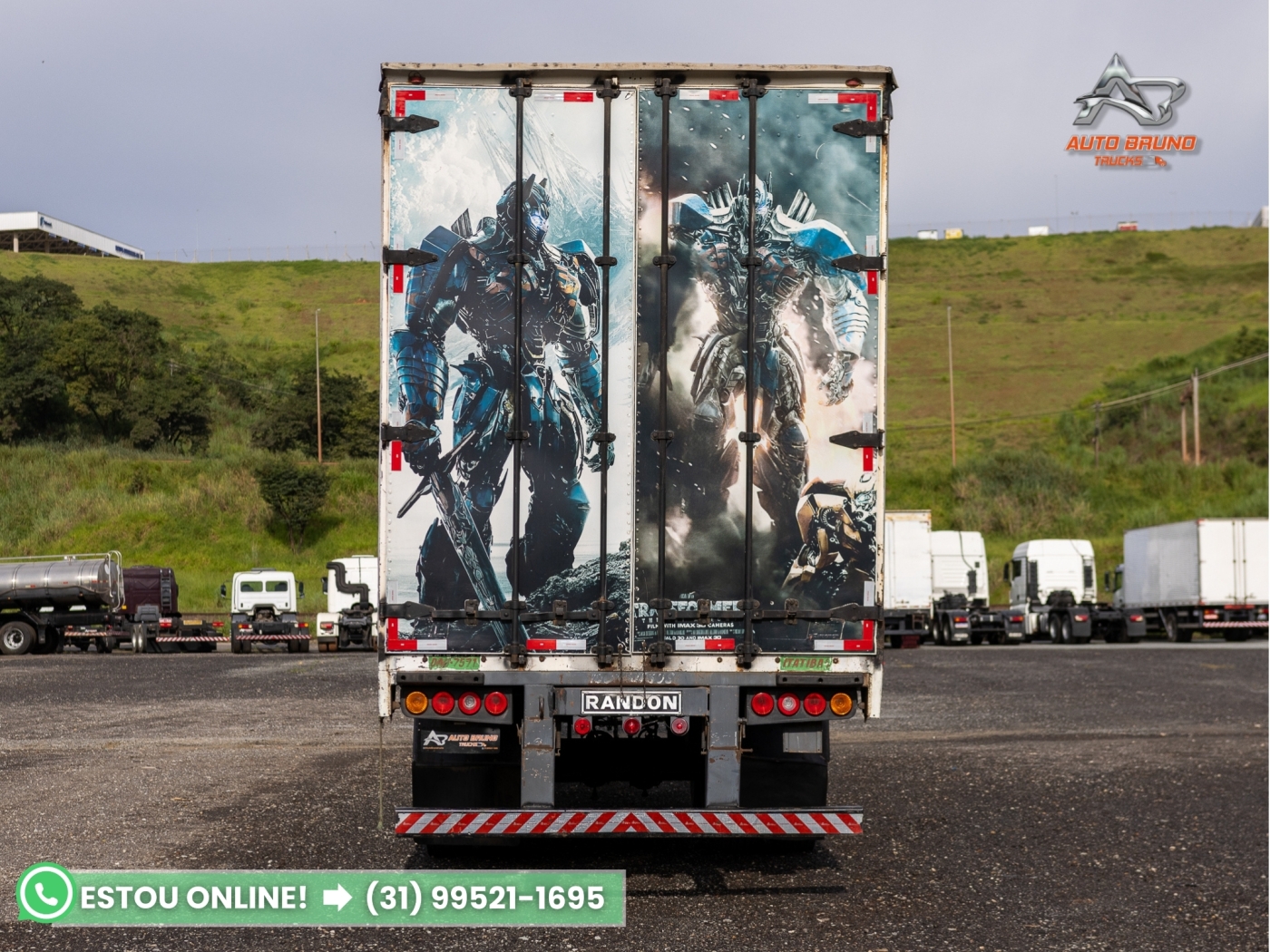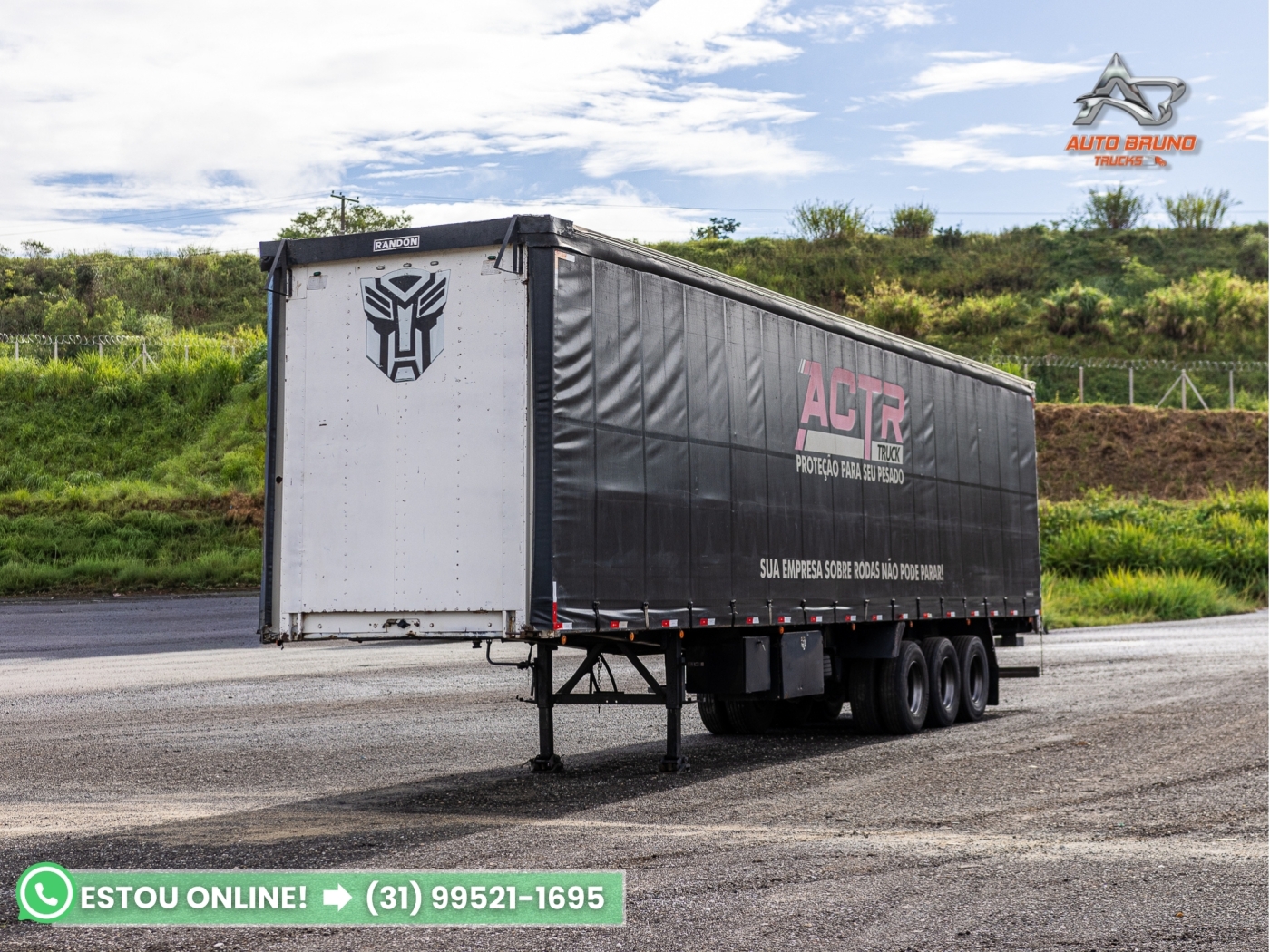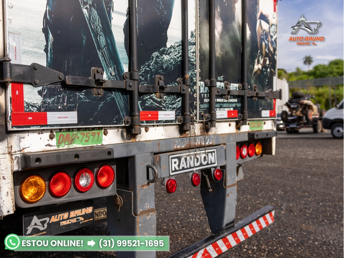 Implemento: Baú sider marca Randon com capacidade para 28 paletes. Medidas internas aproximadas de 14,60m de comprimento, 2,60m de largura e 2,97m de altura. Possui assoalho em chapa, colunas forradas com 3 réguas laterais, 3 linhas de vida e lonas em excelente estado de conservação. Conta também com caixa de ferramentas instalada.