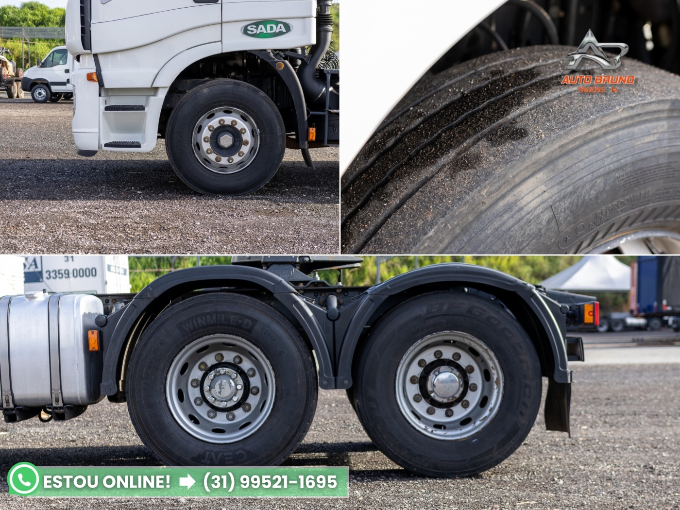 Pneus: Pneus 295/80. Dianteiros com aproximadamente 80% de borracha. Rodado de tração com borrachudos em 50%. Rodado do terceiro eixo (truck) com pneus lisos, também em meia vida.