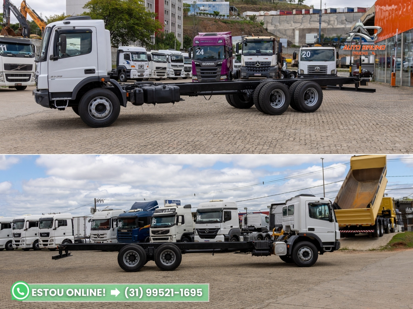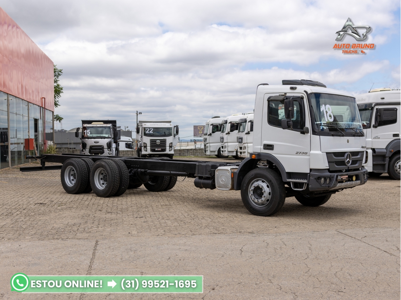 Caminhão Mercedes-Benz Atego 2730 6x4 traçado, ano 2018, com apenas 132.000 km originais, motor original com revisões periódicas em dia. Equipado com pneus novos na tração, cabine com Interclima, bancos em couro, vidros elétricos e ar-condicionado. Suspensão de mola, diferencial bug leve (canelinha), ideal para operações severas como transporte de silo e serviços fora de estrada.