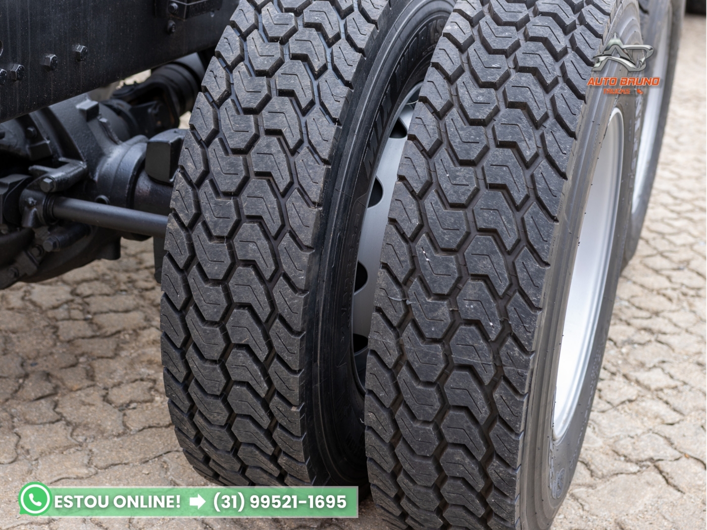 Medida 275/80. Pneus dianteiros com 70% de borracha e conjuntos de tração com pneus borrachudos em estado de novo (100%), conforme fotos.