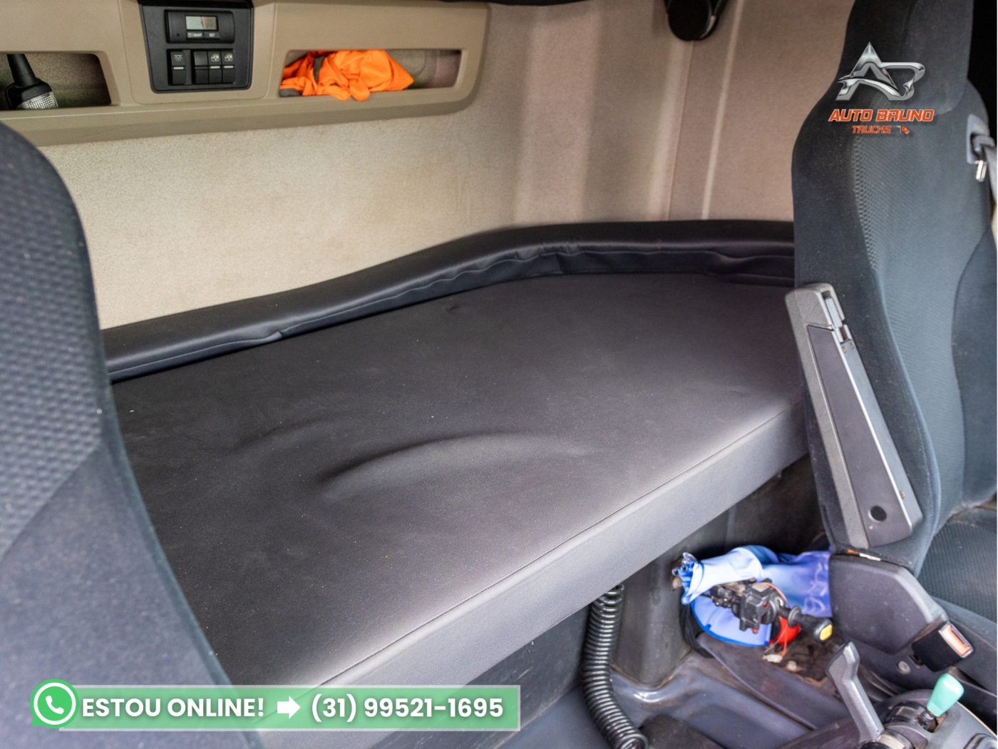 Cabine: Cabine com excelente espaço interno, bem conservada considerando ano e quilometragem. Interior com poucas marcas de uso, mantendo bom estado de bancos, painel e acabamentos.